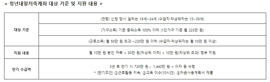 일하는 청년(기준 중위소득 50~100% 이하)이 3년간 매월 10만 원을 저축하면 정부가 월 10만 원을 지원하여, 만기 시에는 총 720만 원의 적립금(본인납입 360만 원 포함)과 이자를 수령하게 됩니다.